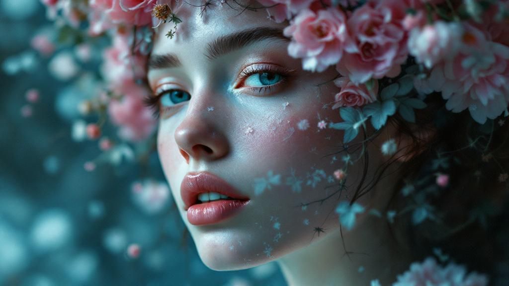 This commitment to enhancement manifests most strikingly in their treatment of public personalities and cultural icons. Brad Pitt appears ethereal and vulnerable; Bill Murray comes across contemplative with botanical elements adorning his features; Drew Barrymore is presented with an intensity that surpasses traditional portrait work. These images resist easy categorisation, existing instead in a liminal space between individuality and projection. The figures remain recognisable yet substantially transformed, transformed through Inez and Vinoodh’s collaborative vision into something far more intricate and visually compelling than conventional celebrity portraiture typically achieves.